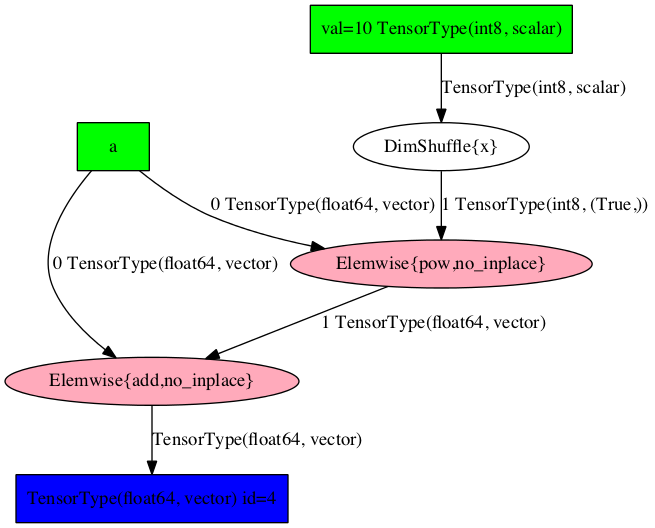Note that the second input is not 2 as we would have expected. This is because 2 was first broadcasted to a matrix of same shape as x. This is done by using the OpDimShuffle: